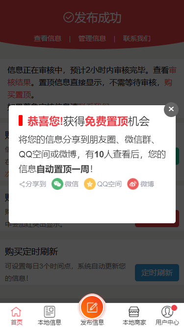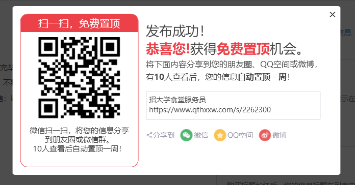 用户可以直接分享到微信朋友圈、微信群、也可以分享到QQ空间、微博等。当有10个人点击后,用户的这条信息就会自动置顶一周了。